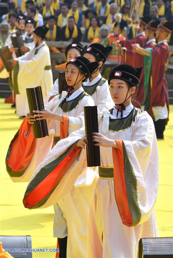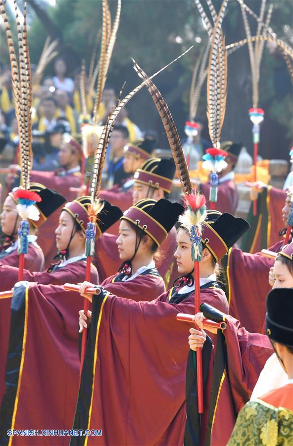 SHANDONG, septiembre 28, 2018 (Xinhua) -- Una ceremonia es llevada a cabo para conmemorar el 2,569 aniversario del nacimiento del antiguo sabio y educador chino Confucio, en el Templo de Confucio en Qufu, su ciudad natal, en la provincia de Shandong, en el este de China, el 28 de septiembre de 2018. Confucio (551-479 aC), educador y filósofo, fundó el confucianismo, una escuela de pensamiento que influyó profundamente en las generaciones posteriores. (Xinhua/Xu Suhui)