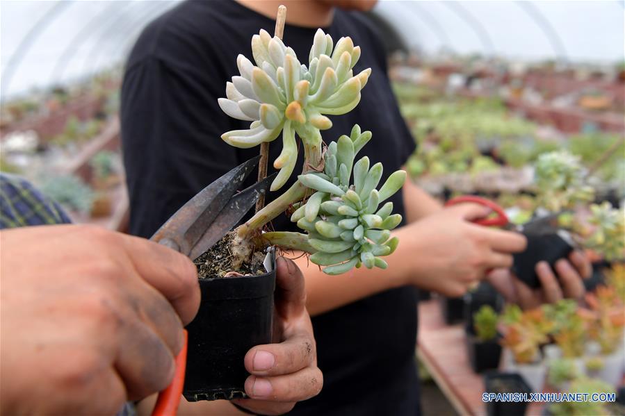 Imagen del 28 de septiembre de 2018 de Peng Rong podando las plantas suculentas con una integrante del personal en un invernadero, en el municipio de Xicun de la ciudad de Yichun, provincia de Jiangxi, en el este de China. Peng Rong comenzó a cultivar las plantas suculentas desde 2014, después de graduarse de la universidad. (Xinhua/Peng Zhaozhi)