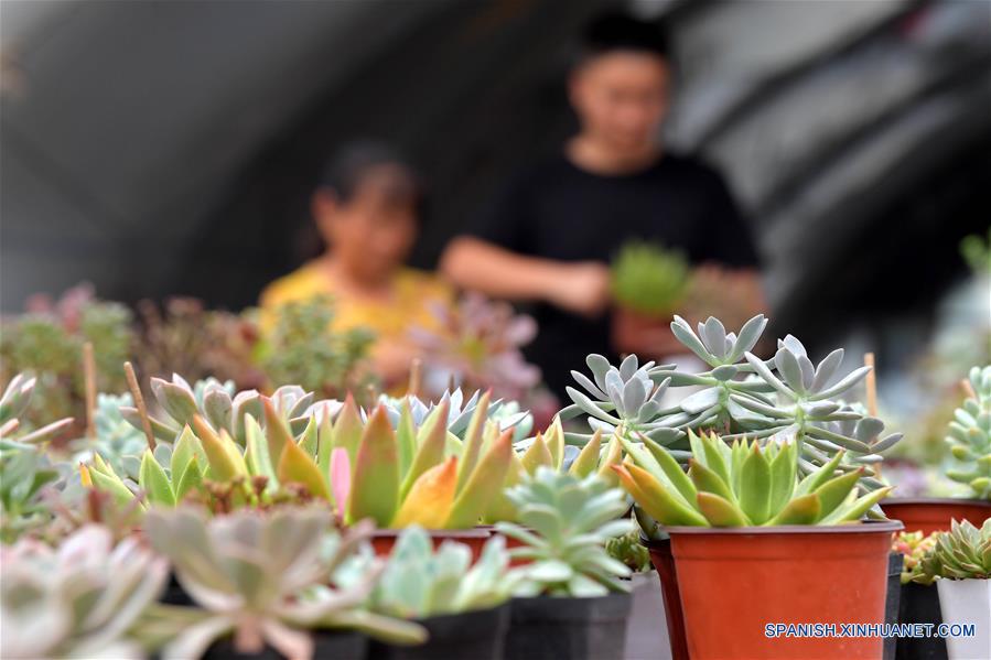 JIANGXI, septiembre 29, 2018 (Xinhua) -- Imagen del 28 de septiembre de 2018 de Peng Rong podando las plantas suculentas con una integrante del personal en un invernadero, en el municipio de Xicun de la ciudad de Yichun, provincia de Jiangxi, en el este de China. Peng Rong comenzó a cultivar las plantas suculentas desde 2014, después de graduarse de la universidad. (Xinhua/Peng Zhaozhi)