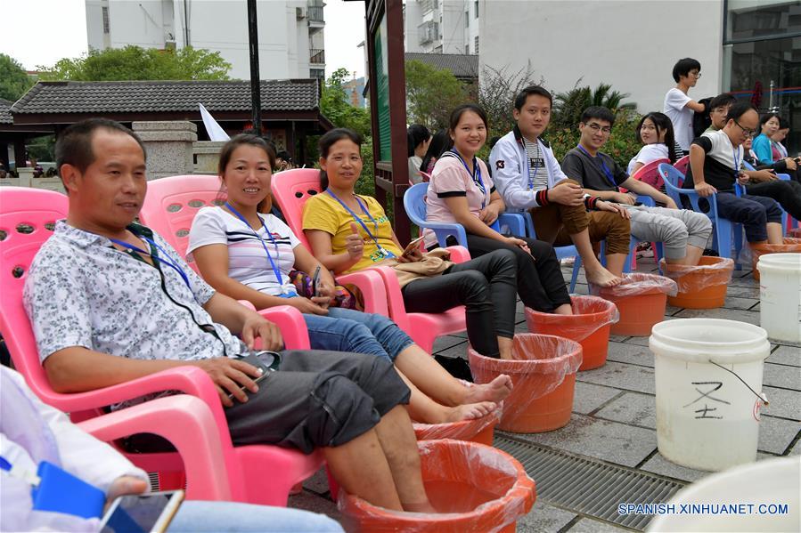 Turistas se lavan los pies en el manantial de aguas termales, en el municipio de Wentang de la ciudad de Yichun, provincia de Jiangxi, en el este de China, el 28 de septiembre de 2018. El municipio de Wentang, famoso por sus manantiales de aguas termales ricas en selenio, ha sido un destino popular para los turistas. (Xinhua/Peng Zhaozhi)