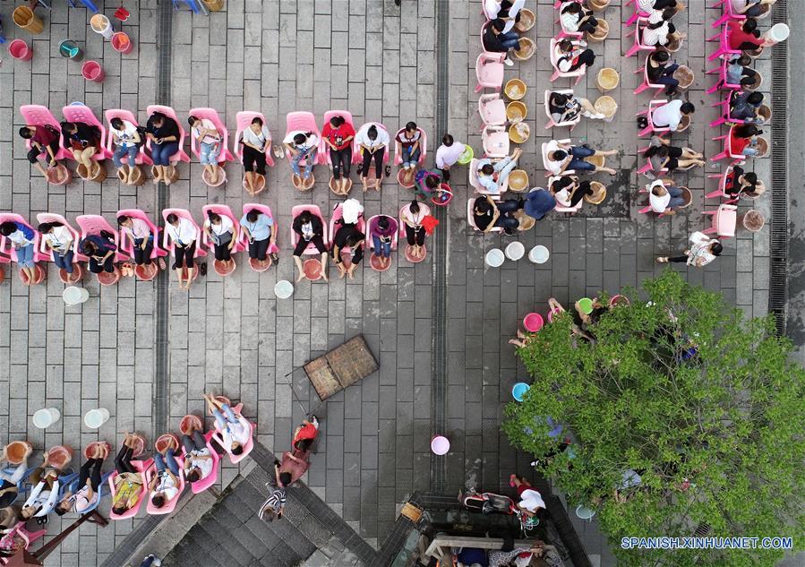 Imagen del 28 de septiembre de 2018 de una vista aérea de turistas lavándose los pies en el manantial de aguas termales, en el municipio de Wentang de la ciudad de Yichun, provincia de Jiangxi, en el este de China. El municipio de Wentang, famoso por sus manantiales de aguas termales ricas en selenio, ha sido un destino popular para los turistas. (Xinhua/Peng Zhaozhi)