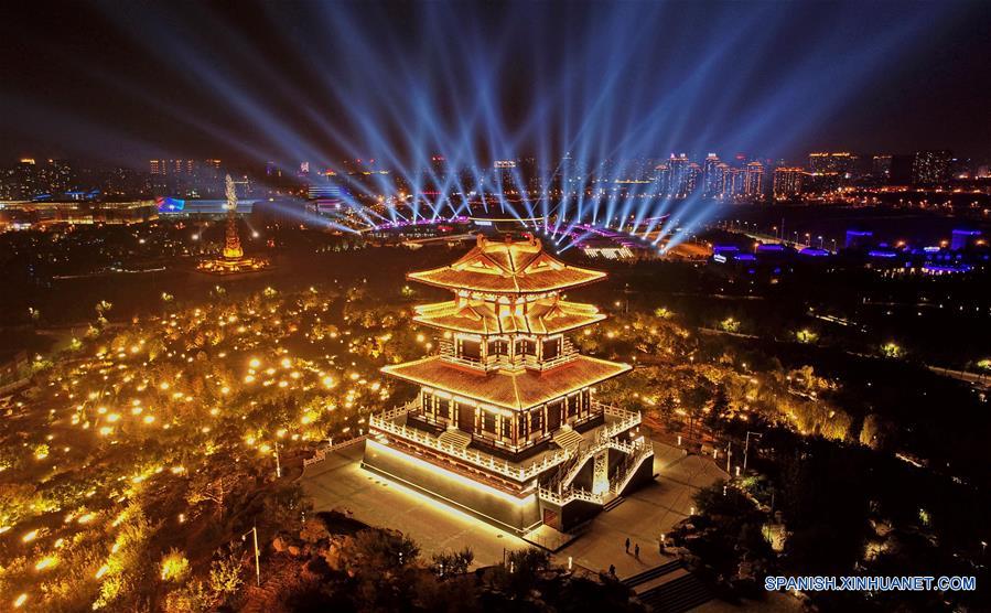 Imagen del 28 de septiembre de 2018 de una vista nocturna aérea del área escénica del lago Nanhu, en la ciudad de Tangshan, provincia de Hebei, en el norte de China. El área escénica fue decorada con iluminación recientemente para dar la bienvenida al próximo Día Nacional. (Xinhua/Yang Shiyao)