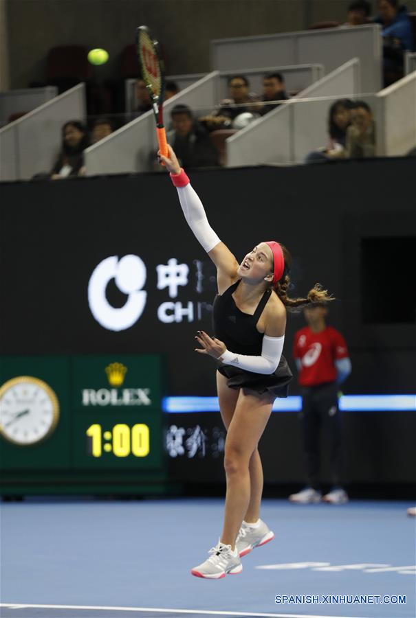 Jelena Ostapenko, de Letonia, sirve la pelota a Magdalena Rybarikova, de Eslovaquia, durante el partido individual femenil de la primera ronda del torneo de tenis Abierto de China, en Beijing, capital de China, el 29 de septiembre de 2018. (Xinhua/Jia Haocheng)