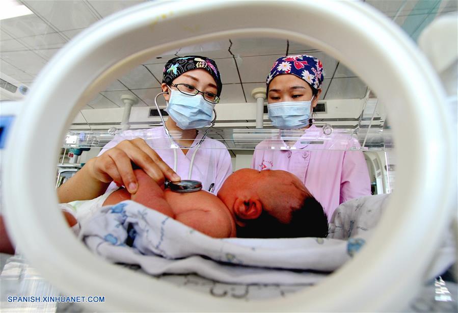 HEBEI, octubre 4, 2018 (Xinhua) -- Enfermeras revisan a un recién nacido en el Primer Hospital del Pueblo de Wu'an, en Wu'an, provincia de Hebei, en el norte de China, el 4 de octubre de 2018. Las personas de diversos sectores permanecen en sus puestos de trabajo durante las vacaciones del Día Nacional. (Xinhua/Wang Xiao)