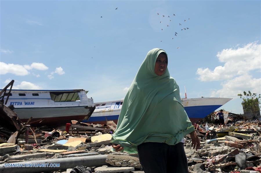 DONGGALA, octubre 5, 2018 (Xinhua) -- Una mujer busca artículos rescatables entre los escombros de una vivienda, en Donggala, provincia de Sulawesi Central, Indonesia, el 5 de octubre de 2018. El número de muertos de los terremotos y el tsunami que asolaron la provincia indonesia de Sulawesi Central hace una semana subió a 1,571 y la operación de búsqueda y rescate se ha extendido, informó el viernes el portavoz de la oficina nacional de gestión de desastres. (Xinhua/Agung Kuncahya B.)