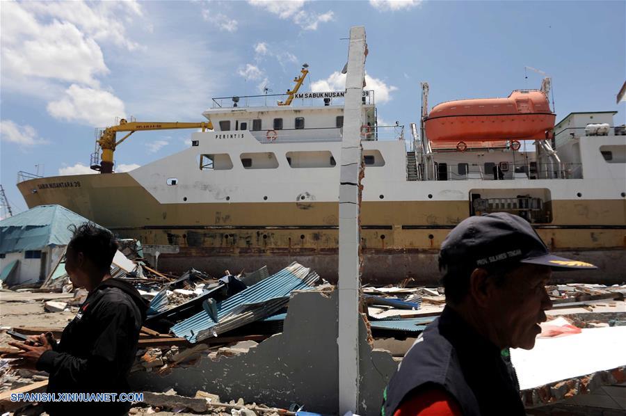 DONGGALA, octubre 5, 2018 (Xinhua) -- Residentes permanecen cerca de las embarcaciones varadas, en Donggala, provincia de Sulawesi Central, Indonesia, el 5 de octubre de 2018. El número de muertos de los terremotos y el tsunami que asolaron la provincia indonesia de Sulawesi Central hace una semana subió a 1,571 y la operación de búsqueda y rescate se ha extendido, informó el viernes el portavoz de la oficina nacional de gestión de desastres. (Xinhua/Agung Kuncahya B.)