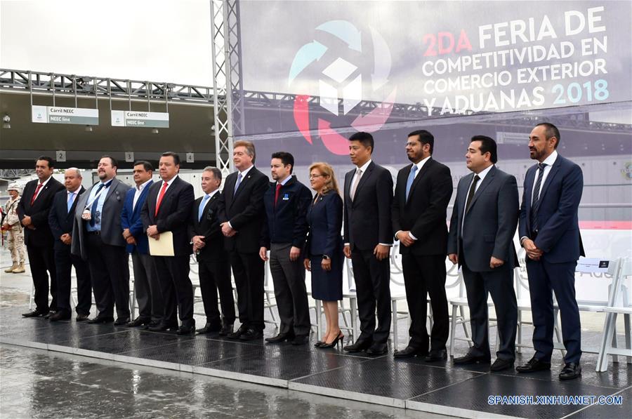 TIJUANA, octubre 5, 2018 (Xinhua) -- Imagen del 4 de octubre de 2018 del cónsul general de China en Tijuana, Yu Bo (4-d), y el gobernador de Baja California, Francisco Vega (c), encabezando la inauguración de la segunda Feria de Competitividad en Comercio Exterior y Aduanas 2018 llevada a cabo en la Aduana de Otay, en la ciudad de Tijuana, estado de Baja California, México. Una delegación del estado mexicano de Baja California participará en la primera Exposición Internacional de Importaciones de China (CIIE, por sus siglas en inglés), en noviembre próximo, en Shanghai, China, dijo el jueves el cónsul chino en la ciudad de Tijuana, Yu Bo, entrevistado tras la inauguración de la segunda "Feria de Competitividad en Comercio Exterior y Aduanas 2018" en la fronteriza ciudad de Tijuana. (Xinhua/Omar Martínez)