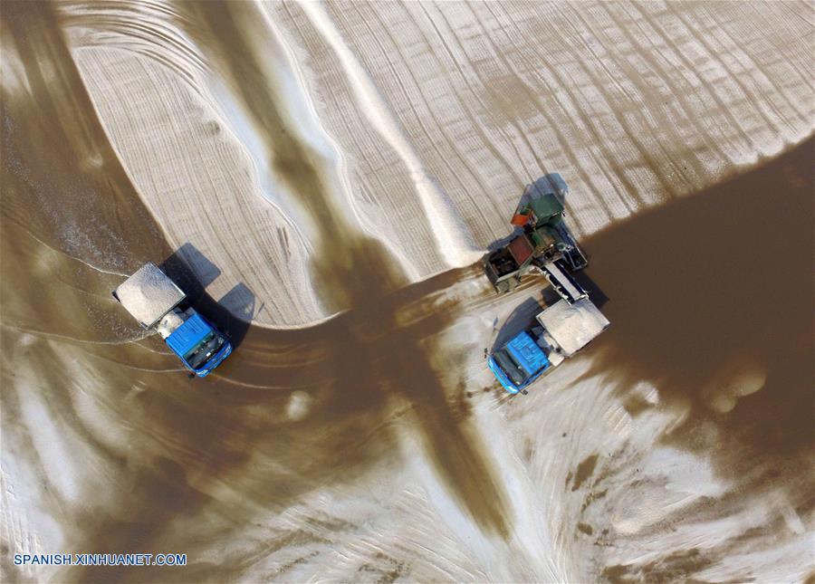 SHANDONG, octubre 4, 2018 (Xinhua) -- Trabajadores manipulan máquinas para cosechar sal en las salinas en la ciudad de Binzhou, provincia de Shandong, en el este de China, el 4 de octubre de 2018. Las salinas entraron en temporada de cosecha recientemente. (Xinhua/Guo Zhihua)