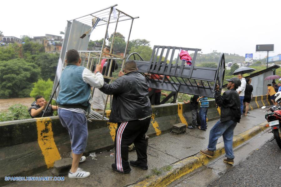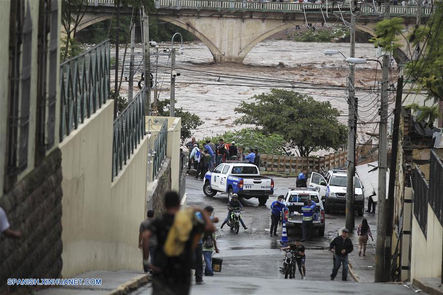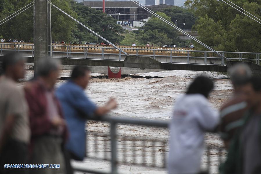 TEGUCIGALPA, octubre 6, 2018 (Xinhua) -- Personas observan el desbordamiento del río Choluteca debido a las fuertes lluvias, en Tegucigalpa, Honduras, el 6 de octubre de 2018. La Comisión Permanente de Contingencias (Copeco) de Honduras, declaró el sábado alerta roja para tres departamentos debido a las lluvias que azotan ese país y que han dejado dos personas muertas y decenas de evacuados. (Xinhua/Rafael Ochoa)