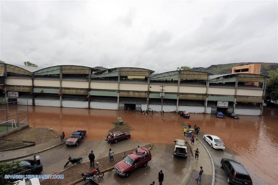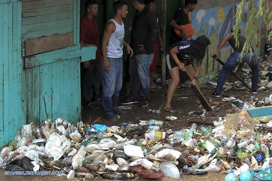 TEGUCIGALPA, octubre 6, 2018 (Xinhua) -- Residentes quitan basura que tapa una alcantarilla para intentar impedir que el agua siga entrando a sus puestos de venta en un mercado por el desbordamiento del río Choluteca debido a las fuertes lluvias, en Tegucigalpa, Honduras, el 6 de octubre de 2018. La Comisión Permanente de Contingencias (Copeco) de Honduras, declaró el sábado alerta roja para tres departamentos debido a las lluvias que azotan ese país y que han dejado dos personas muertas y decenas de evacuados. (Xinhua/Rafael Ochoa)