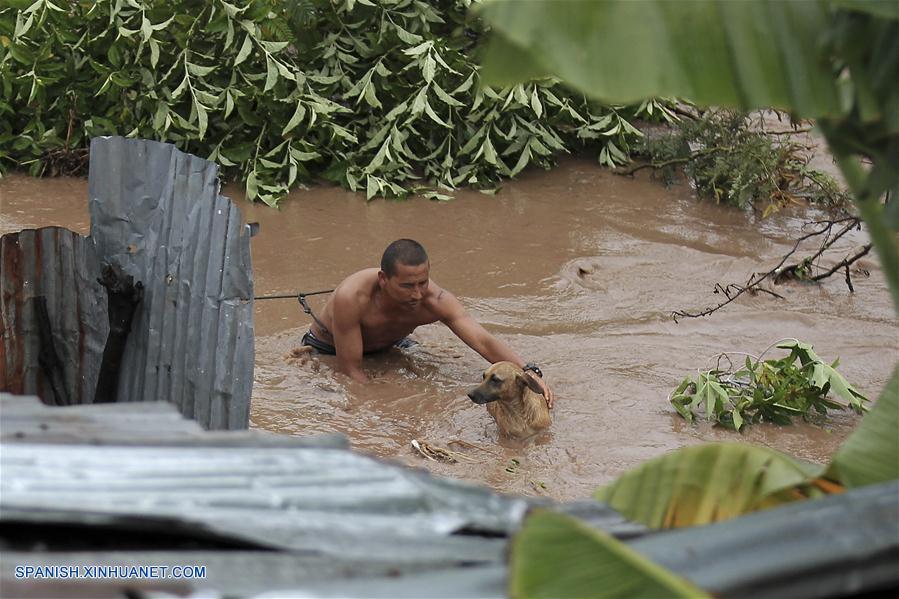 TEGUCIGALPA, octubre 6, 2018 (Xinhua) -- Un residente rescata a un perro atrapado en las aguas de inundación por el desbordamiento del río Choluteca debido a las fuertes lluvias, en Tegucigalpa, Honduras, el 6 de octubre de 2018. La Comisión Permanente de Contingencias (Copeco) de Honduras, declaró el sábado alerta roja para tres departamentos debido a las lluvias que azotan ese país y que han dejado dos personas muertas y decenas de evacuados. (Xinhua/Rafael Ochoa)