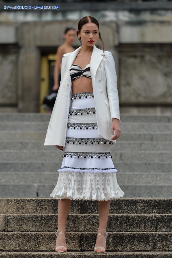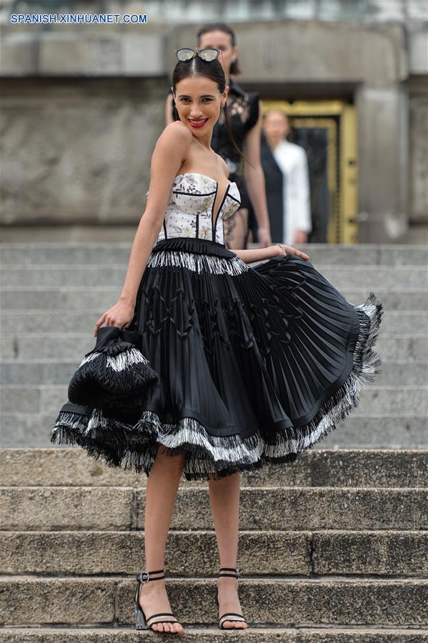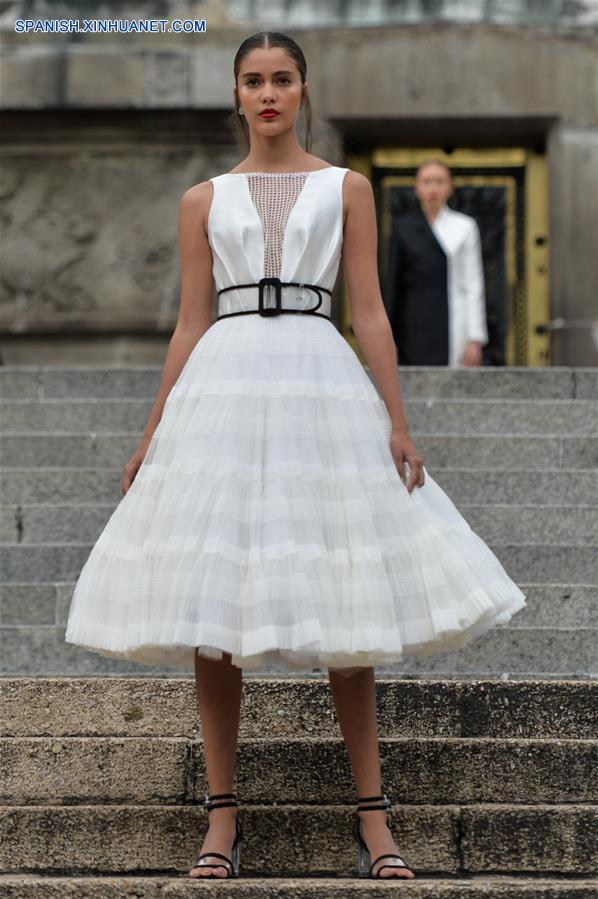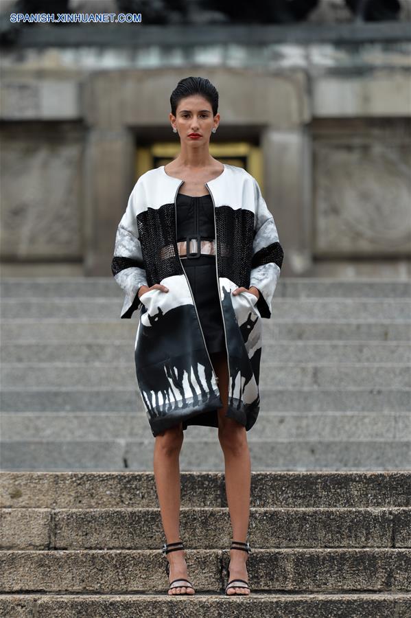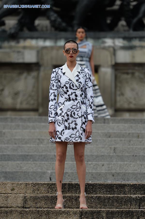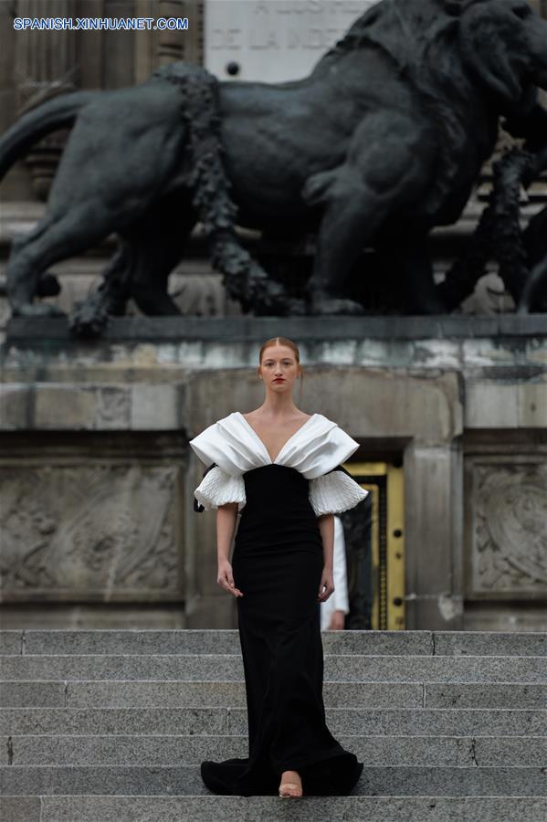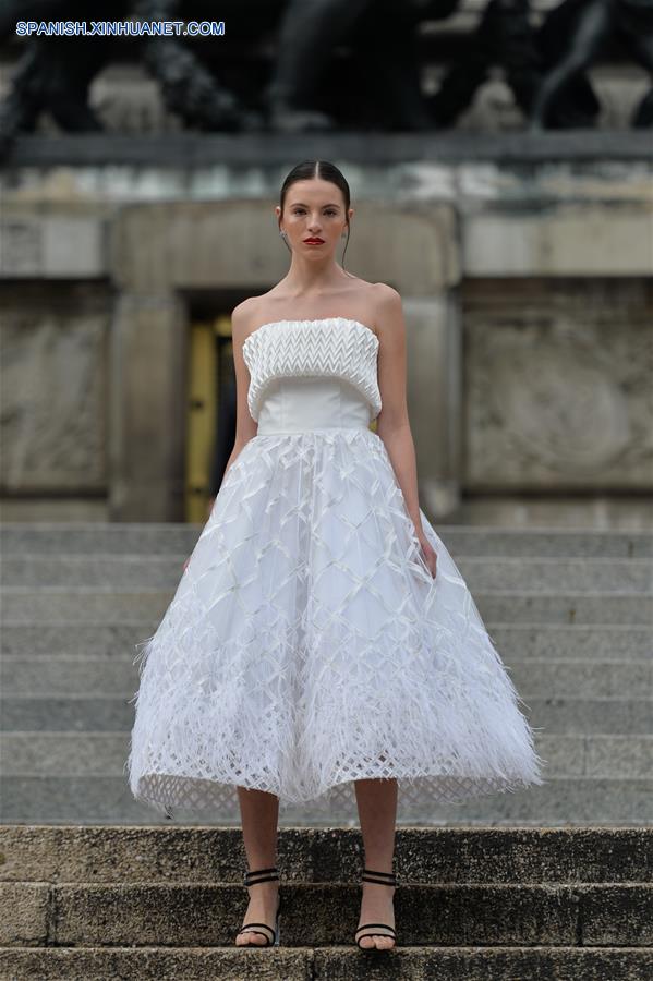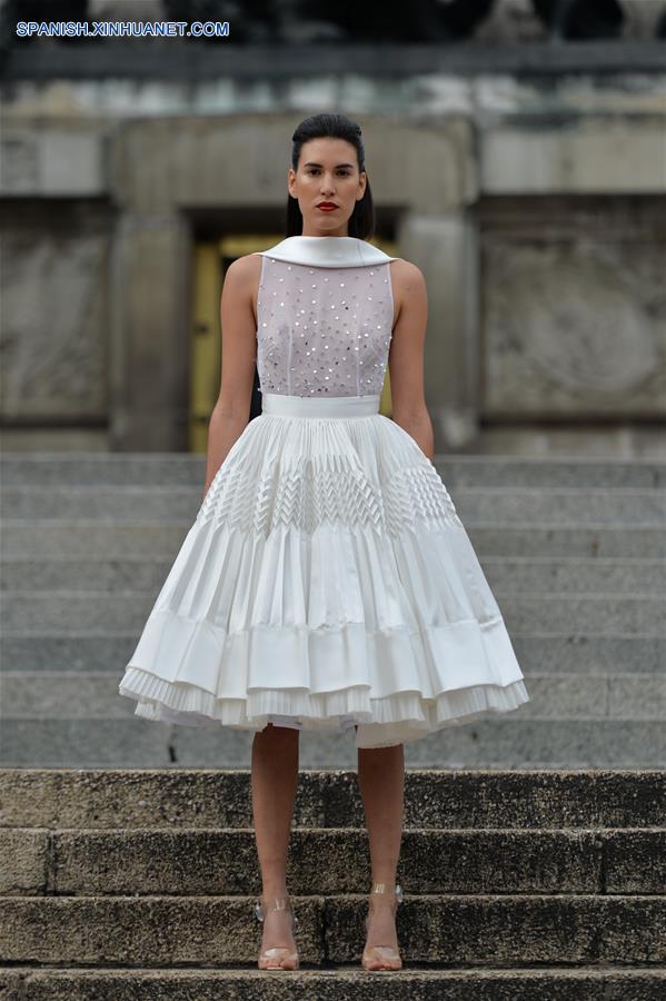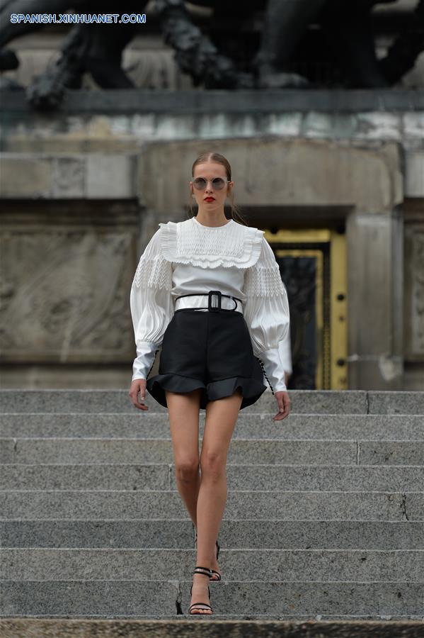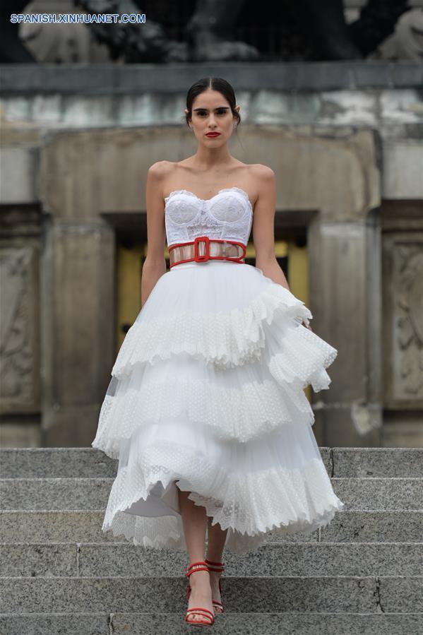 CIUDAD DE MEXICO, octubre 7, 2018 (Xinhua) -- Una modelo presenta una creación del dise?ador mexicano Benito Santos, durante la Mercedes-Benz Fashion Week Mexico City, en el Monumento a la Independencia en la Ciudad de México, capital de México, el 7 de octubre de 2018. (Xinhua/Xin Yuewei)
