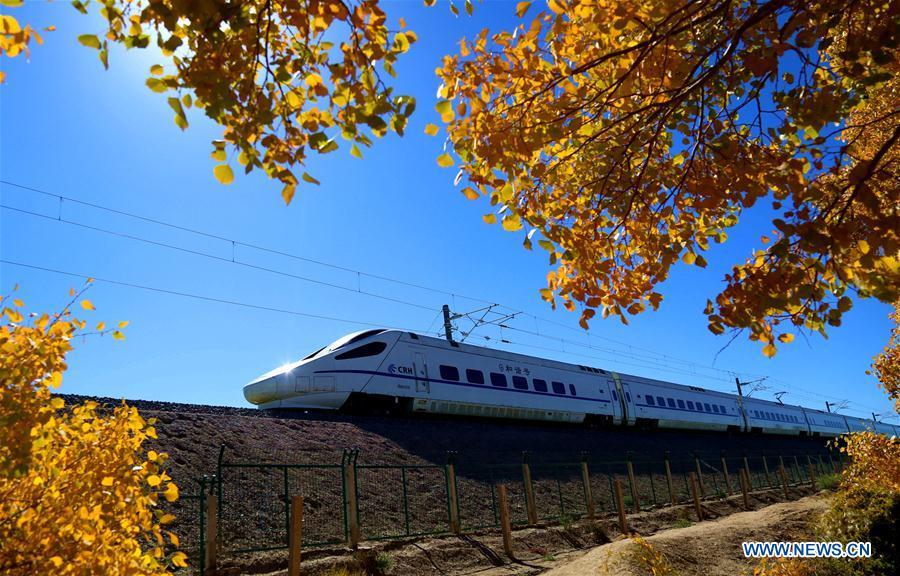 Dunhuang, Gansu, 08/10/2018(El Pueblo en Línea) - Un tren bala atraviesa el bosque de Populus euphratica, comúnmente conocido como el Desierto de álamos, en Mogao, Dunhuang, provincia de Gansu, 6 de octubre del 2018. (Foto: Xinhua/ Zhang Xiaoliang)