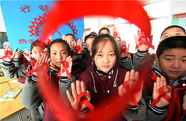 Estudiantes de una escuela primaria en Donghai, provincia de Jiangsu, elaboran lazos rojos como parte de una campa?a de prevención del VIH/SIDA. (Foto: Zhang Zhengyou/ China Daily)