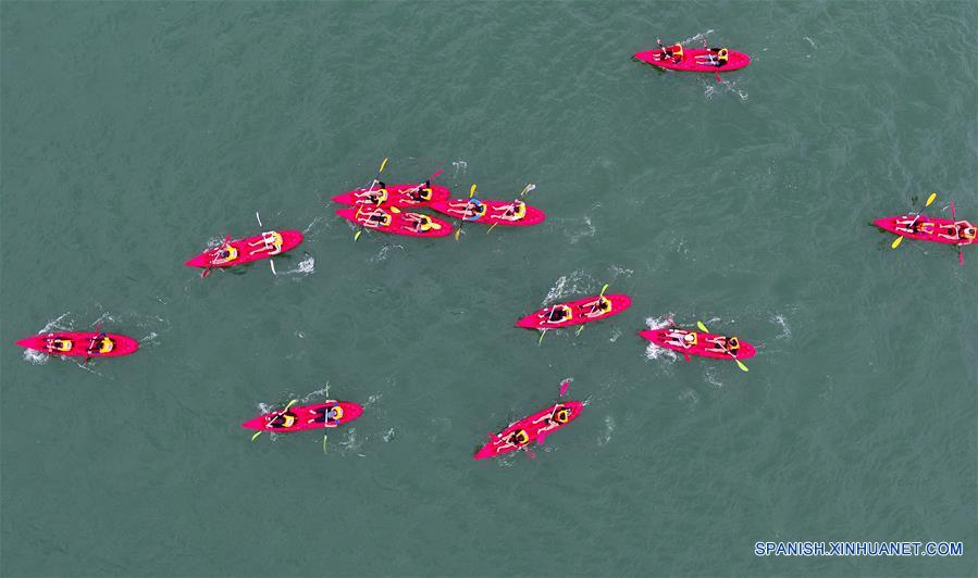 LIUZHOU, octubre 14, 2018 (Xinhua) -- Vista aérea de personas participando en una competencia de canotaje, en el río Liujiang en Liuzhou, en la Región Autónoma Zhuang de Guangxi, en el sur de China, el 14 de octubre de 2018. El evento se llevó a cabo entre sábado y domingo y atrajo a unos 500 entusiastas del canotaje nacionales e internacionales. (Xinhua/Li Hanchi)