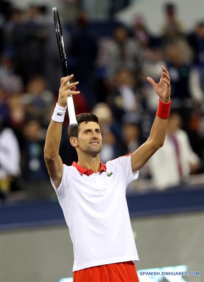 Novak Djokovic, de Serbia, festeja su triunfo al termino del partido individual varonil de semifinal del torneo de tenis Maestros de Shanghai de la Asociación de Tenistas Profesionales (ATP), ante Alexander Zverev, de Alemania, en Shanghai, en el este de China, el 13 de octubre de 2018. Djokovic ganó el encuentro. (Xinhua/Fan Jun)