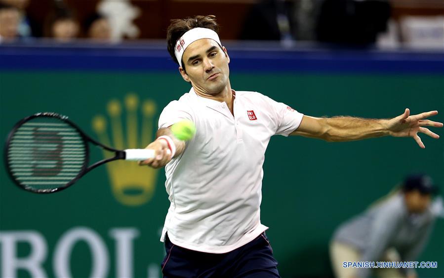 Roger Federer, de Suiza, devuelve la pelota a Borna Coric, de Croacia, durante el partido individual varonil de semifinal del torneo de tenis Maestros de Shanghai de la Asociación de Tenistas Profesionales (ATP), en Shanghai, en el este de China, el 13 de octubre de 2018. Federer perdió el encuentro. (Xinhua/Fan Jun)