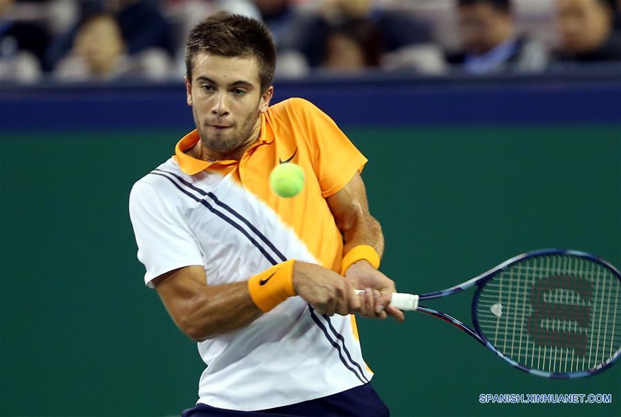 Borna Coric, de Croacia, devuelve la pelota a Roger Federer, de Suiza, durante el partido individual varonil de semifinal del torneo de tenis Maestros de Shanghai de la Asociación de Tenistas Profesionales (ATP), en Shanghai, en el este de China, el 13 de octubre de 2018. (Xinhua/Fan Jun)