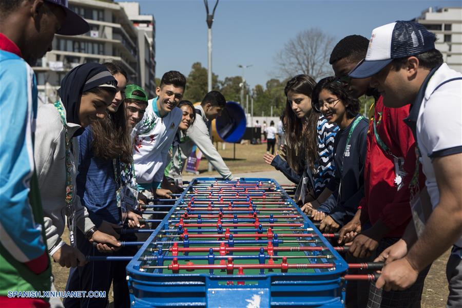 BUENOS AIRES, octubre 14, 2018 (Xinhua) -- Imagen del 13 de octubre de 2018, de deportistas y voluntarios jugando fútbol de mesa en la plaza central en la Villa Olímpica, en el marco de los Juegos Olímpicos de la Juventud de Buenos Aires 2018, en la ciudad de Buenos Aires, Argentina. La Villa Olímpica, donde se hospedan los 4,012 atletas de los Juegos Olímpicos de la Juventud de Buenos Aires 2018, se transformó en los últimos días en un escenario multicolor de amistad y camaradería. En el lugar, en el sur de la ciudad, barrio de Villa Soldati, se alojan deportistas de 206 delegaciones de países y regiones de los cinco continentes. Desde días antes de la prueba, la zona se llenó de movimiento con el ir y venir de los competidores, que se relacionaron entre sí a pesar de las dificultades de comunicación por los distintos idiomas. El inglés era el más utilizado para los diálogos, varios de ellos risue?os, y cada teléfono móvil fue sumando nuevos amigos en las redes sociales a un ritmo tan vertiginoso como las distintas disciplinas de los Juegos. (Xinhua/Martín Zabala)