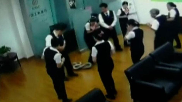 Las imágenes de vídeo vigilancia muestran a la serpiente, de 1,5 metros, cayendo dramáticamente sobre un grupo de empleados bancarios que se habían reunido. Los aterrorizados miembros del personal se dispersaron rápidamente con horror cuando la serpiente se deslizó por la habitación antes de esconderse detrás de un sofá.