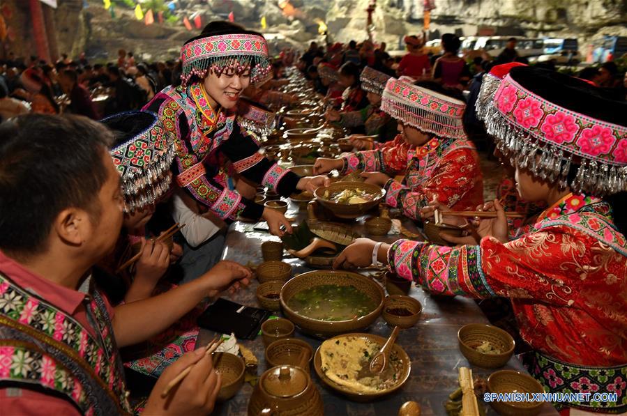 Imagen del 14 de octubre de 2018 de integrantes del grupo étnico Miao disfrutando de la comida durante un banquete de mesa larga llevado a cabo en un geoparque en el condado de Xingwen, provincia de Sichuan, en el suroeste de China. El banquete de mesa larga es una forma tradicional del grupo étnico Miao de conmemorar festivales importantes y entretener invitados. (Xinhua/Zhang Guojun)
