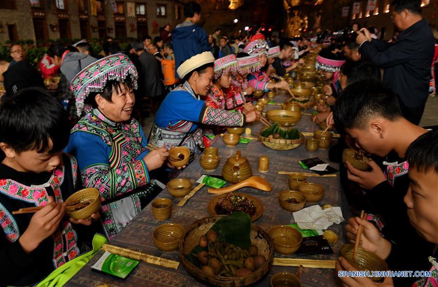 Imagen del 14 de octubre de 2018 de integrantes del grupo étnico Miao disfrutando de la comida durante un banquete de mesa larga llevado a cabo en un geoparque en el condado de Xingwen, provincia de Sichuan, en el suroeste de China. El banquete de mesa larga es una forma tradicional del grupo étnico Miao de conmemorar festivales importantes y entretener invitados. (Xinhua/Zhang Guojun)