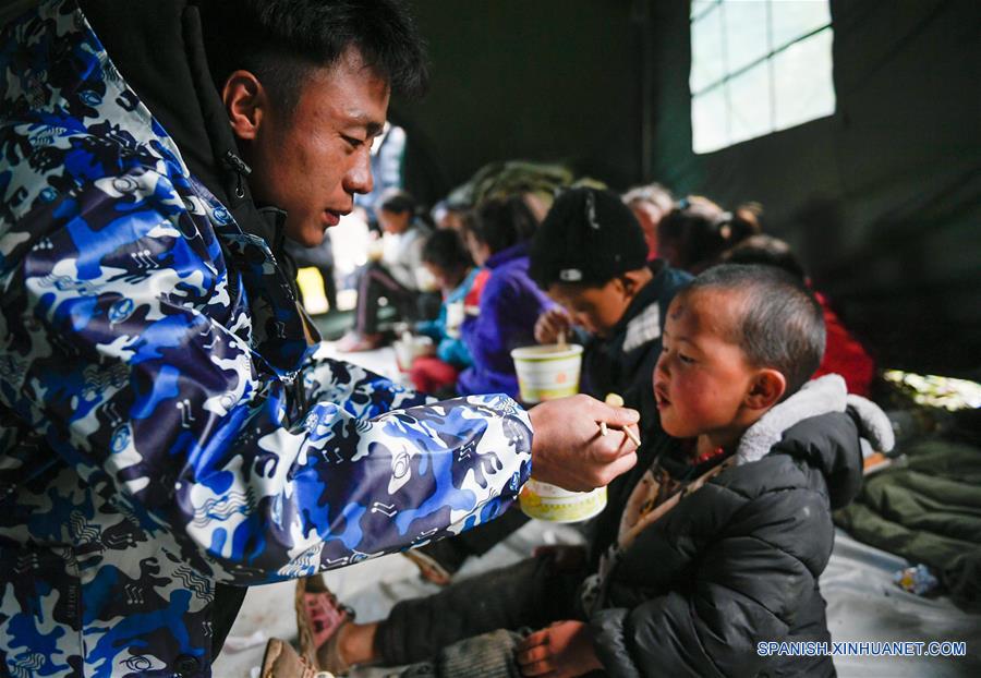 Imagen del 14 de octubre de 2018 de un trabajador alimentando a un ni?o en un asentamiento temporal en el municipio Bolo del condado de Jomda en Qamdo, región autónoma del Tíbet, en el suroeste de China. El nivel del agua de un lago de barrera formado por un desprendimiento de tierras en una sección del río Jinsha, en el suroeste de China, volvió a la normalidad el domingo en la noche sin que se hayan reportado víctimas, dijeron las autoridades. (Xinhua/Liu Dongjun)