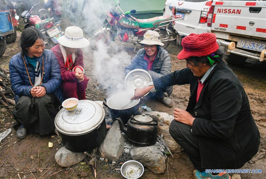 Imagen del 14 de octubre de 2018 de personas provenientes del área afectada por un desprendimiento de tierras cocinando en un asentamiento temporal en el municipio Bolo del condado de Jomda en Qamdo, región autónoma del Tíbet, en el suroeste de China. El nivel del agua de un lago de barrera formado por un desprendimiento de tierras en una sección del río Jinsha, en el suroeste de China, volvió a la normalidad el domingo en la noche sin que se hayan reportado víctimas, dijeron las autoridades. (Xinhua/Liu Dongjun)