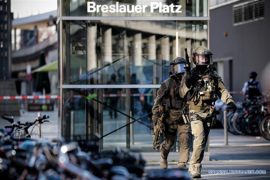 Policías salen de la Estación Central de trenes de Colonia, en Colonia, Alemania, el 15 de octubre de 2018. La policía alemana puso fin el lunes a la toma de rehén en la Estación Central de trenes de Colonia y liberó a una mujer luego de horas de tensión. (Xinhua/Ulrich Hufnagel)