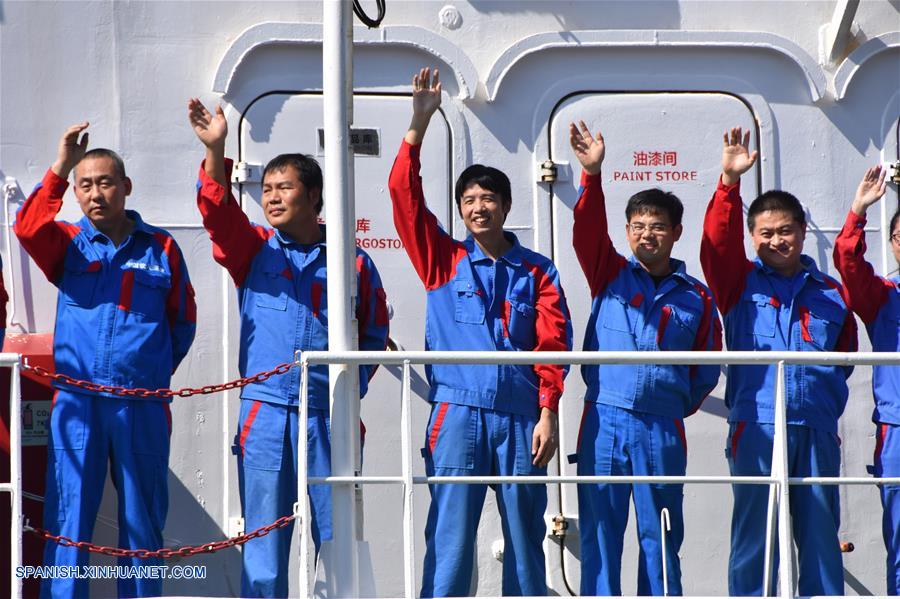 HAINAN, octubre 16, 2018 (Xinhua) -- Científicos de la expedición saludan a la multitud de bienvenida después de regresar al puerto de origen, en Sanya, provincia de Hainan, en el sur de China, el 16 de octubre de 2018. Un equipo de 59 investigadores chinos regresó el martes a Sanya de la Fosa de las Marianas después de completar una misión de investigación en aguas profundas de 7,292 millas náuticas, de 54 días de duración. (Xinhua/Liu Deng)