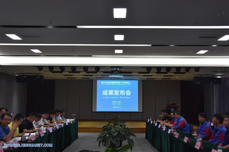 HAINAN, octubre 16, 2018 (Xinhua) -- Una conferencia mostrando los resultados fructíferos en la misión de investigación en aguas profundas es llevada a cabo en el Instituto de Misión de Investigación de Alta Mar de la Academia de Ciencias de China, en Sanya, provincia de Hainan, en el sur de China, el 16 de octubre de 2018. Un equipo de 59 investigadores chinos regresó el martes a Sanya de la Fosa de las Marianas después de completar una misión de investigación en aguas profundas de 7,292 millas náuticas, de 54 días de duración. (Xinhua/Liu Deng)