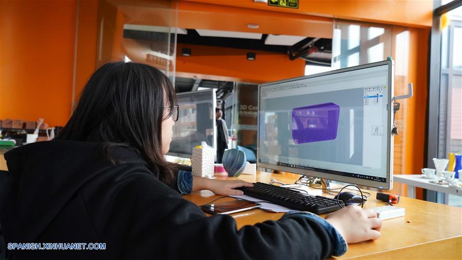 JIANGXI, octubre 16, 2018 (Xinhua) -- Una joven dise?a un patrón de impresión de cerámica en 3D, en un centro de impresión en 3D, en el área de creación cultural de Taoxichuan, en la ciudad de Jingdezhen, en la provincia de Jiangxi, en el este de China, el 16 de octubre de 2018. La tecnología de impresión en 3D ha facilitado la creación de figuras de cerámica, reduciendo el proceso de 72 pasos a tres, y el tiempo de medio mes a tres horas. Jingdezhen es conocido como la capital de la porcelana de China, con una historia de 1,000 a?os de elaboración de cerámica de calidad. (Xinhua/Hu Chenhuan)