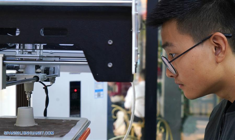 JIANGXI, octubre 16, 2018 (Xinhua) -- Un empleado monitorea una impresora en 3D creando una figura de cerámica, en un centro de impresión en 3D, en el área de creación cultural de Taoxichuan, en la ciudad de Jingdezhen, en la provincia de Jiangxi, en el este de China, el 16 de octubre de 2018. La tecnología de impresión en 3D ha facilitado la creación de figuras de cerámica, reduciendo el proceso de 72 pasos a tres, y el tiempo de medio mes a tres horas. Jingdezhen es conocido como la capital de la porcelana de China, con una historia de 1,000 a?os de elaboración de cerámica de calidad. (Xinhua/Hu Chenhuan)