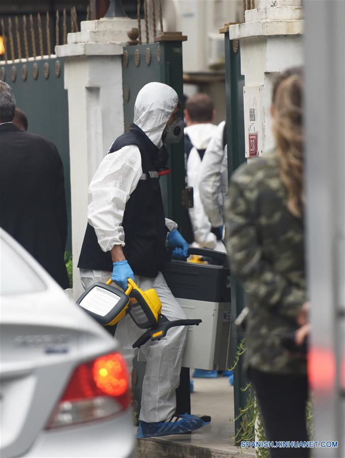 ESTAMBUL, octubre 17, 2018 (Xinhua) -- Un policía turco entra a la residencia del cónsul general de Arabia Saudí, en Estambul, Turquía, el 17 de octubre de 2018. Un equipo turco entró el miércoles en la residencia del cónsul general de Arabia Saudí en Estambul para buscar mayor evidencia sobre la desaparición del periodista saudí Jamal Khashoggi. (Xinhua/He Canling)