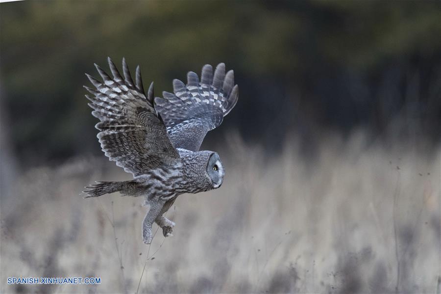 YAKESHI, octubre 18, 2018 (Xinhua) -- Imagen del 17 de octubre de 2018 de un gran búho gris volando en un bosque en la localidad de Wunu'er de la ciudad de Yakeshi, en la Región Autónoma de Mongolia Interior, en el norte de China. El gran búho gris es un animal salvaje bajo protección de segundo grado de China. (Xinhua/Str)