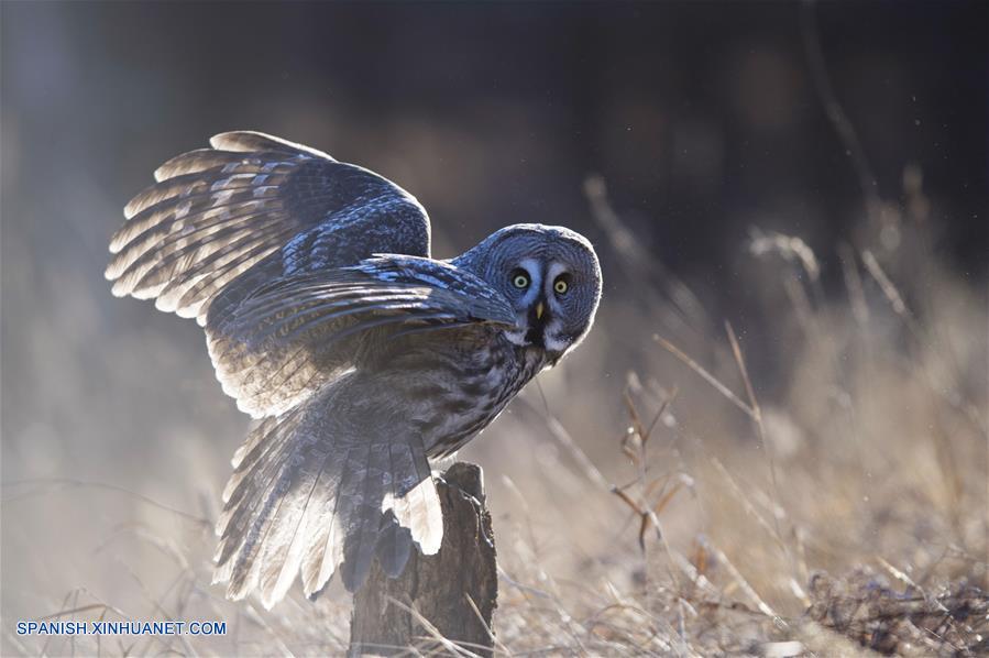 YAKESHI, octubre 18, 2018 (Xinhua) -- Imagen del 17 de octubre de 2018 de un gran búho gris aleteando en un bosque en la localidad de Wunu'er de la ciudad de Yakeshi, en la Región Autónoma de Mongolia Interior, en el norte de China. El gran búho gris es un animal salvaje bajo protección de segundo grado de China. (Xinhua/Str)