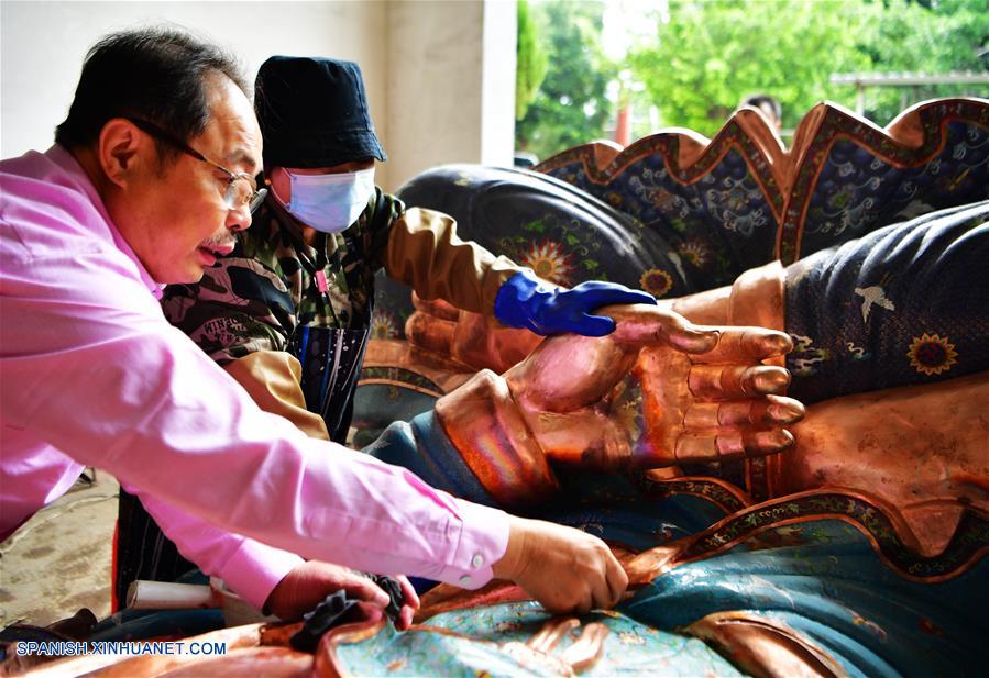 PUTIAN, octubre 18, 2018 (Xinhua) -- Lin Hui trabaja en un rinoceronte de esmalte, en Putian, provincia de Fujian, en el sureste de China, el 18 de octubre de 2018. Lin Hui es un heredero del Patrimonio Cultural Intangible de las figuras de cloisonné de Lin, o esmaltado de cobre, un tipo de artesanía tradicional china. (Xinhua/Wei Peiquan)