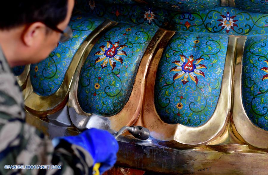 PUTIAN, octubre 18, 2018 (Xinhua) -- Lin Hui trabaja en una obra de esmalte, en Putian, provincia de Fujian, en el sureste de China, el 18 de octubre de 2018. Lin Hui es un heredero del Patrimonio Cultural Intangible de las figuras de cloisonné de Lin, o esmaltado de cobre, un tipo de artesanía tradicional china. (Xinhua/Wei Peiquan)