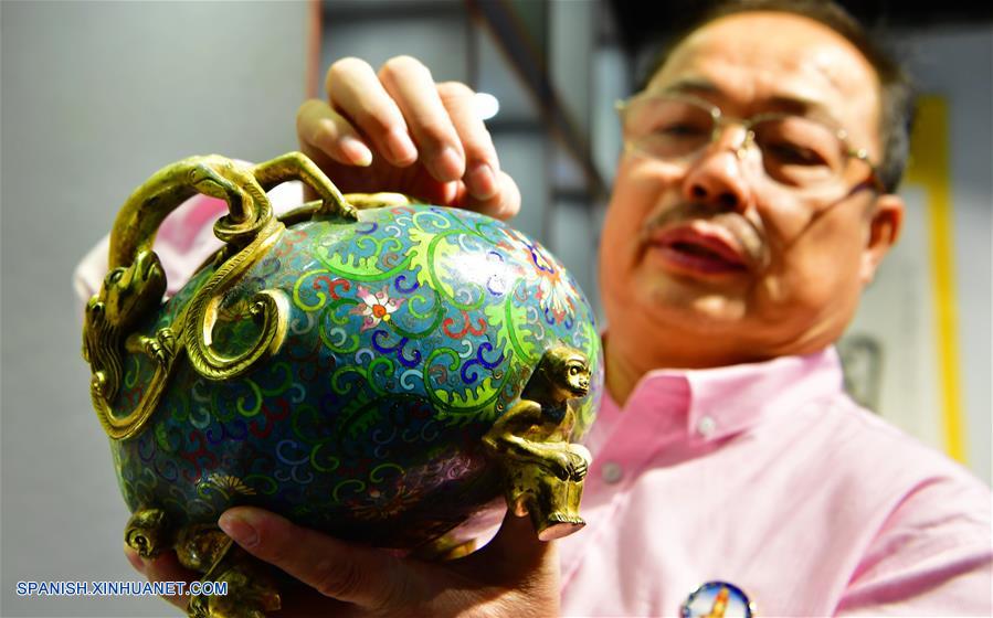PUTIAN, octubre 18, 2018 (Xinhua) -- Lin Hui presenta un trabajo de esmalte, en Putian, provincia de Fujian, en el sureste de China, el 18 de octubre de 2018. Lin Hui es un heredero del Patrimonio Cultural Intangible de las figuras de cloisonné de Lin, o esmaltado de cobre, un tipo de artesanía tradicional china. (Xinhua/Wei Peiquan)