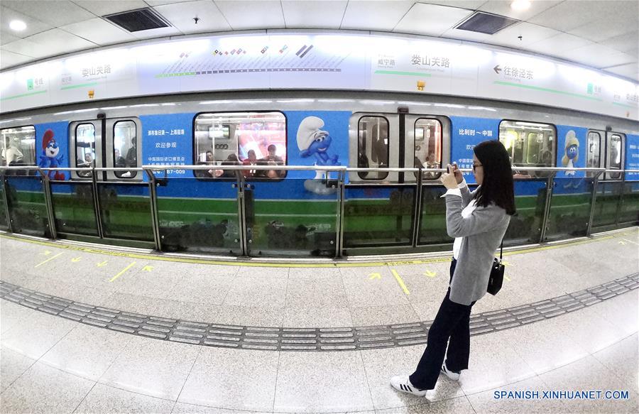 Una mujer toma fotografías del tren tématico China-Bélgica de la Línea 2 del Metro de Shanghai que tiene imágenes de personajes del cómic belga "Los Pitufos", en Shanghai, en el este de China, el 20 de octubre de 2018. El tren tématico fue lanzado por el Metro de Shanghai el sábado como un servicio especial para conmemorar la próxima Exposición Internacional de Importaciones de China (CIIE, por sus siglas en inglés). (Xinhua/Fang Zhe)