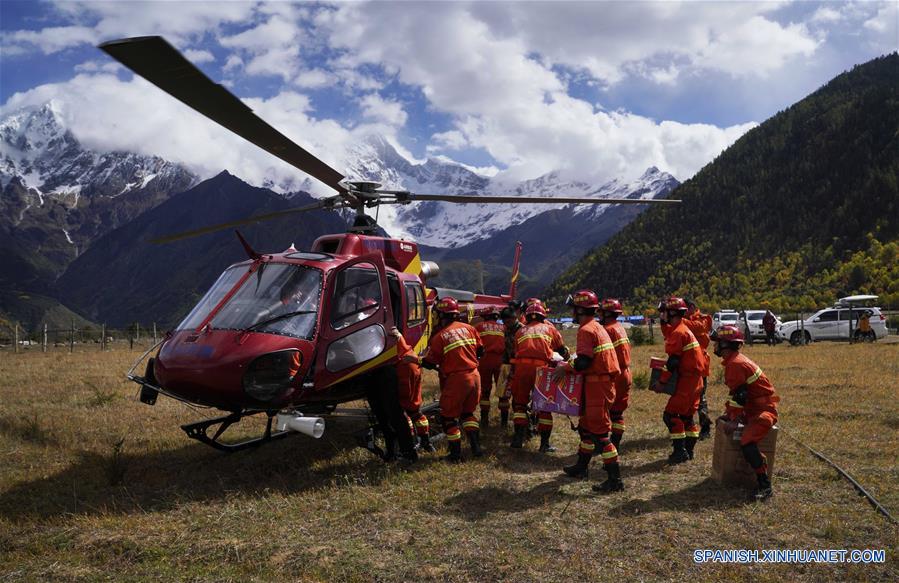 Rescatistas cargan un helicóptero con materiales de socorro para el área del desastre de un lago de barrera causado por un desprendimiento de tierras, en el condado de Menling, en la Región Autónoma del Tibet, el 20 de octubre de 2018. Un helicóptero de Xilin Fengteng General Aviation Co., Ltd. participó en el alivio de desastre para transportar materiales de socorro. El lago de barrera se formó cerca de una villa en el condado de Menling después que los desprendimientos de tierras ocurridos el miércoles y jueves bloquearon la vía fluvial del río Yarlung Tsangpo. (Xinhua/Purbu Zhaxi)