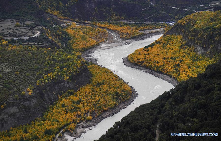 Vista aérea del río Yarlung Tsangpo después de un desbordamiento de un lago de barrera causado por un desprendimiento de tierras en el río Yarlung Tsangpo, en el condado de Menling, en la Región Autónoma del Tibet, el 20 de octubre de 2018. El nivel del agua está disminuyendo luego de un desagüe en el lago de barrera que se formó a causa de un desprendimiento de tierras en el río Yarlung Tsangpo en la Región Autónoma del Tibet, en el suroeste de China, se?alaron el viernes funcionarios locales. (Xinhua/Purbu Zhaxi)