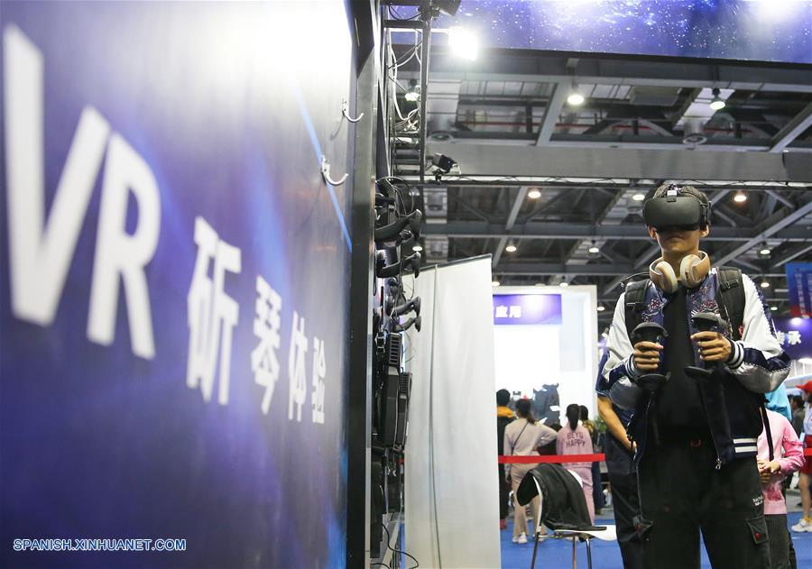 JIANGXI, octubre 19, 2018 (Xinhua) -- Un visitante (i) prueba un dispositivo de Realidad Virtual (RV) durante la Conferencia Mundial de la Industria de RV 2018, en Nanchang, provincia de Jiangxi, en el este de China, el 19 de octubre de 2018. La Conferencia Mundial de la Industria de Realidad Virtual (RV) 2018 se inauguró el viernes en la ciudad china de Nanchang, capital de la provincia oriental de Jiangxi, en la que será posible conocer los últimos avances de esta técnica en el mundo. El evento de tres días contará con una exposición sobre RV y foros centrados en ésta, en la inteligencia artificial y en la tecnología 5G. (Xinhua/Peng Zhaozhi)