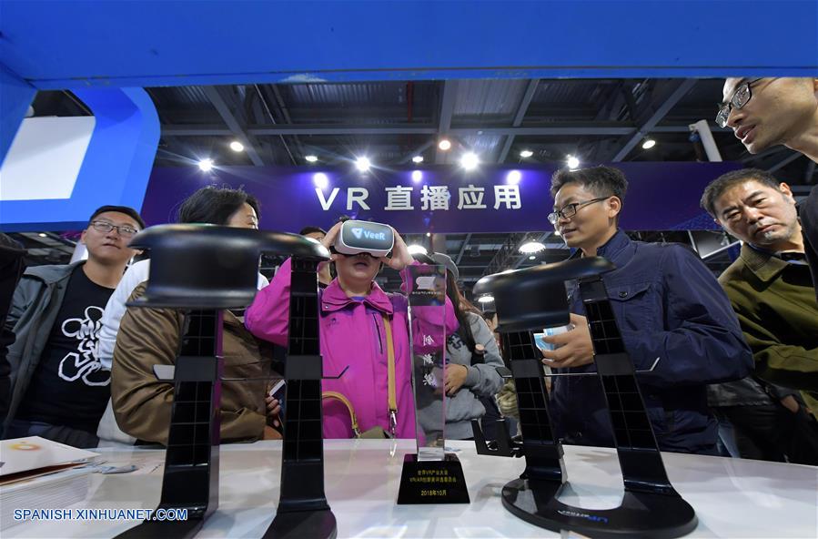 JIANGXI, octubre 19, 2018 (Xinhua) -- Una visitante prueba un dispositivo de transmisión en vivo de Realidad Virtual (RV) durante la Conferencia Mundial de la Industria de RV 2018, en Nanchang, provincia de Jiangxi, en el este de China, el 19 de octubre de 2018. La Conferencia Mundial de la Industria de Realidad Virtual (RV) 2018 se inauguró el viernes en la ciudad china de Nanchang, capital de la provincia oriental de Jiangxi, en la que será posible conocer los últimos avances de esta técnica en el mundo. El evento de tres días contará con una exposición sobre RV y foros centrados en ésta, en la inteligencia artificial y en la tecnología 5G. (Xinhua/Peng Zhaozhi)