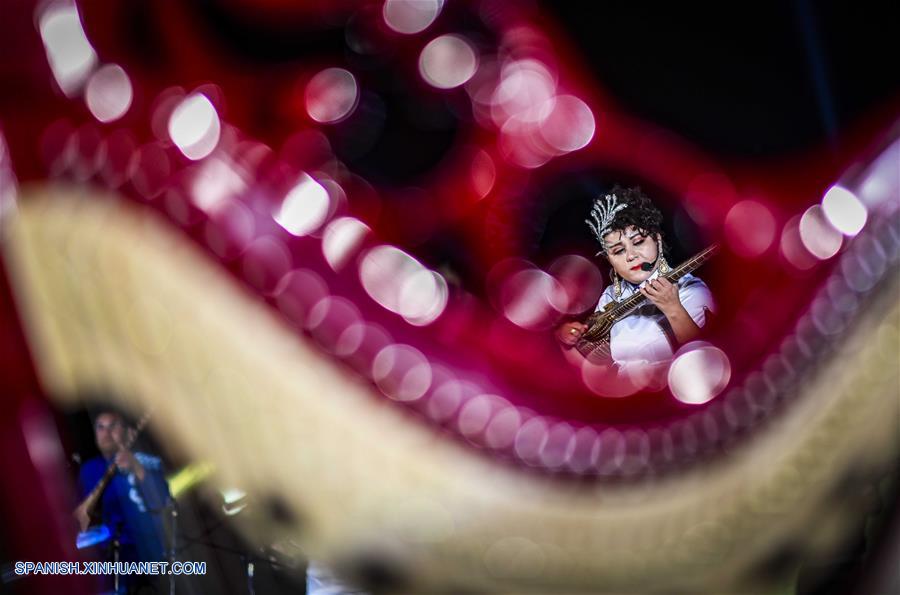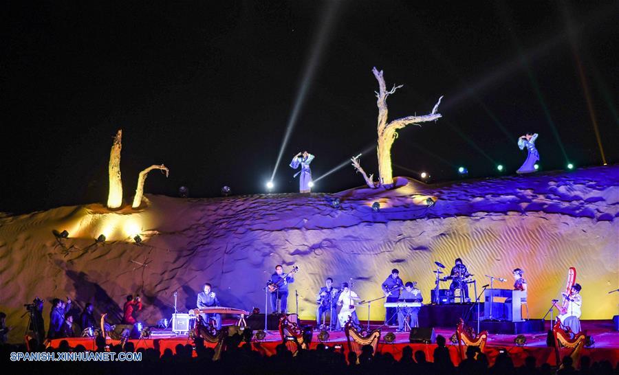 XINJIANG, octubre 21, 2018 (Xinhua) -- Imagen del 20 de octubre de 2018, de artistas realizando una presentación durante un concierto temático sobre el desierto llevado a cabo en el condado de Qiemo, en la Prefectura Autónoma Mongola de Bayingolin, en la Región Autónoma Uygur de Xinjiang, en el noroeste de China. (Xinhua/Zhao Ge)