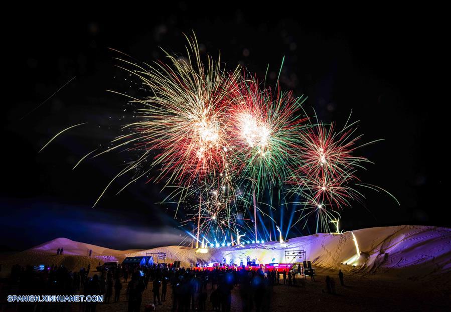 XINJIANG, octubre 21, 2018 (Xinhua) -- Imagen del 20 de octubre de 2018, de fuegos artificiales explotando en el cielo durante un concierto temático sobre el desierto llevado a cabo en el condado de Qiemo, en la Prefectura Autónoma Mongola de Bayingolin, en la Región Autónoma Uygur de Xinjiang, en el noroeste de China. (Xinhua/Zhao Ge)