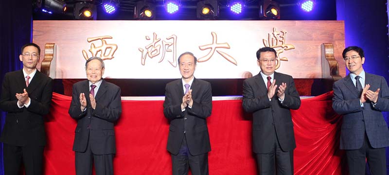 Shi Yigong, presidente de la Universidad del Lago del Oeste (a la izquierda); Yang Zhenning, premio Nobel (segundo a la izquierda); Yuan Jiajun, gobernador de Zhejiang (segundo a la derecha) y Han Qide, ex vicepresidente del Buró Consultivo Político Nacional (al centro), durante la ceremonia de fundación de la Universidad del Lago del Oeste, en Hangzhou, provincia de Zhejiang, 20 de octubre del 2018. (Foto: China Daily)