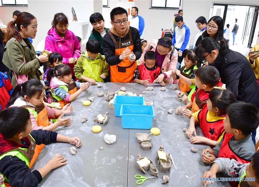 Imagen del 21 de octubre de 2018 de ni?os aprendiendo a hacer cerámica en la ciudad de Tongchuan, provincia de Shaanxi, en el noroeste de China. Una serie de actividades fueron llevadas a cabo para conmemorar la cerámica kiln de Yaozhou, que tiene más de 1,400 a?os de historia. (Xinhua/Shao Rui)