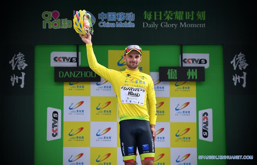 HAINAN, octubre 23, 2018 (Xinhua) -- Jakub Mareczko, del equipo Wilier Triestina de Italia porta la casaca amarilla en el podio después de la primera etapa de la Carrera de Ciclismo de Ruta Internacional Tour de Hainan 2018 en Danzhou, en la provincia de Hainan, en el sur de China, el 23 de octubre de 2018. (Xinhua/Guo Cheng)