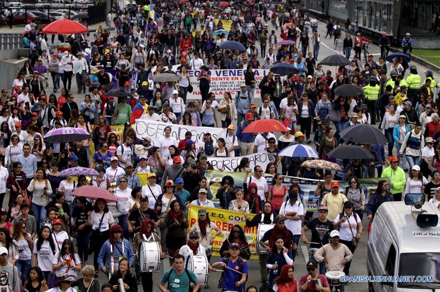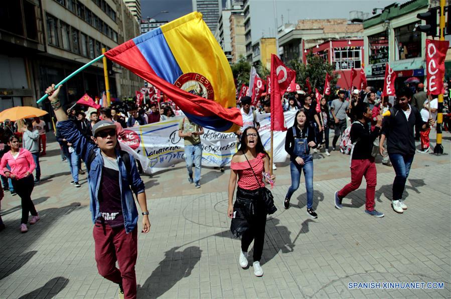 BOGOTA, octubre 23, 2018 (Xinhua) -- Personas participan en una protesta para exigir la protección de derechos de maestros y estudiantes del país, en Bogotá, Colombia, el 23 de octubre de 2018. La Federación Colombiana de Trabajadores de la Educación de Colombia (FECODE) informó este martes que más de 350,000 profesores participaron el martes en el paro de 24 horas convocado para exigir al Gobierno Nacional que proteja los derechos de maestros y estudiantes del país. Según los manifestantes es urgente que el Gobierno invierta en la infraestructura de las universidades y en el pago justo a los docentes que son quienes guían el futuro del país en medio de un periodo de posconflicto, tras la firma del acuerdo de paz con las FARC. (Xinhua/Sergio Acero/COLPRENSA)